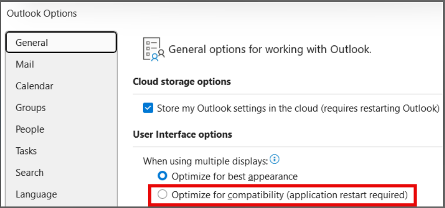 Workaround: Under File > Options > General > User Interface options select the option Optimize for compatibility and restart Outlook. - ENG-7120 - Investigate the possibilities to prevent problems with the position of the Zivver toolbar.